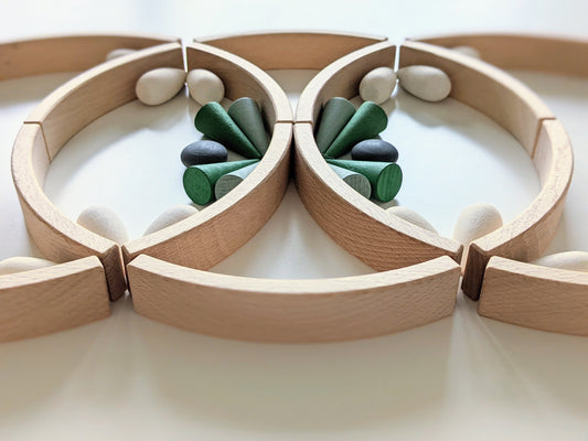 The simple curved wooden blocks come without instructions and challenge children's imagination and creativity.