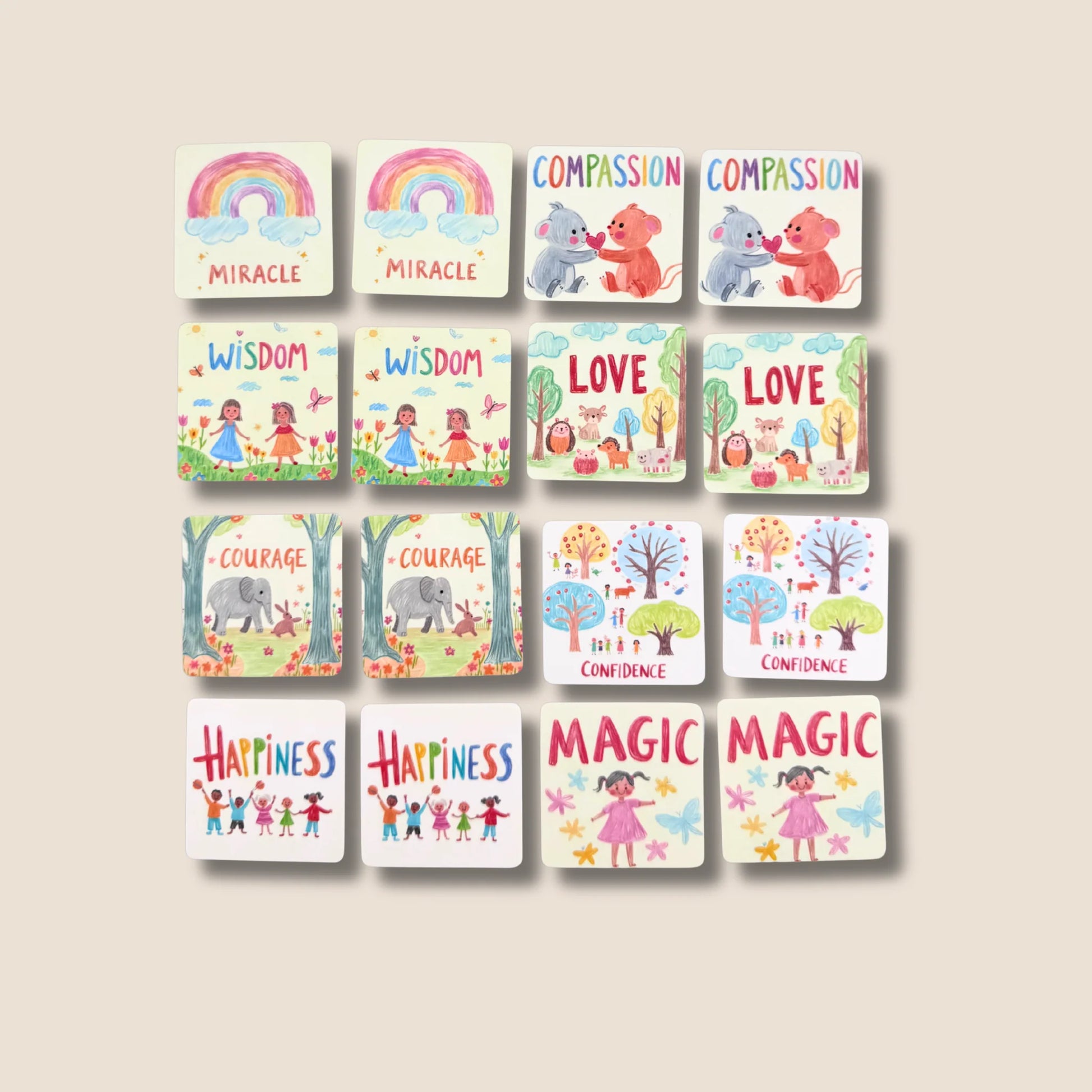 Designed for kids ages 3–12, this game turns simple matching into a moment of learning, laughter, and connection. Each pair introduces a mindful word, helping children grow their vocabulary while boosting confidence and calm.
