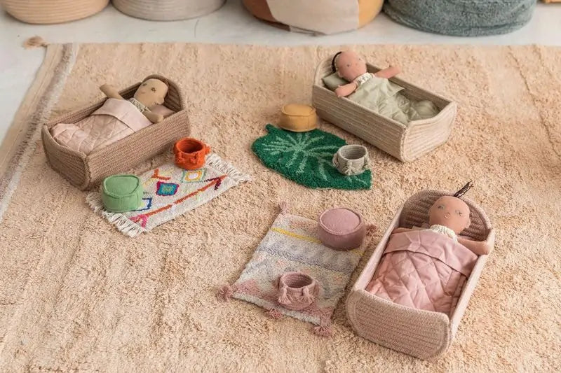 I’m a handmade textile doll made with a lot of love. My set includes a mini crib with a mattress, pillow, and bedding, as well as a decor set featuring miniature versions of our best-selling designs, such as the Kaarol rug, Tassels basket, and Chill poufto to decorate my little home.