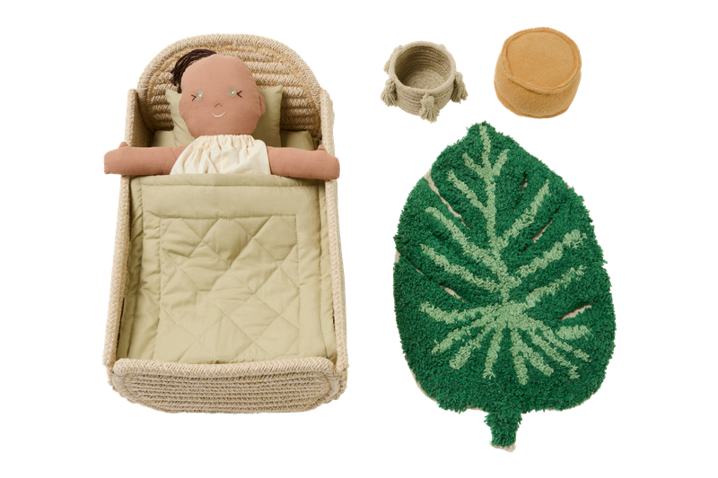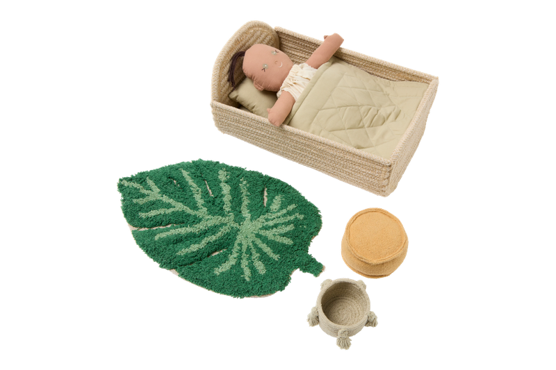 I’m a handmade textile doll made with a lot of love. My set includes a mini crib with a mattress, pillow, and bedding, as well as a decor set featuring miniature versions of our best-selling designs, such as the Monstera rug, Tassels basket, and Chill pouf to decorate my home.