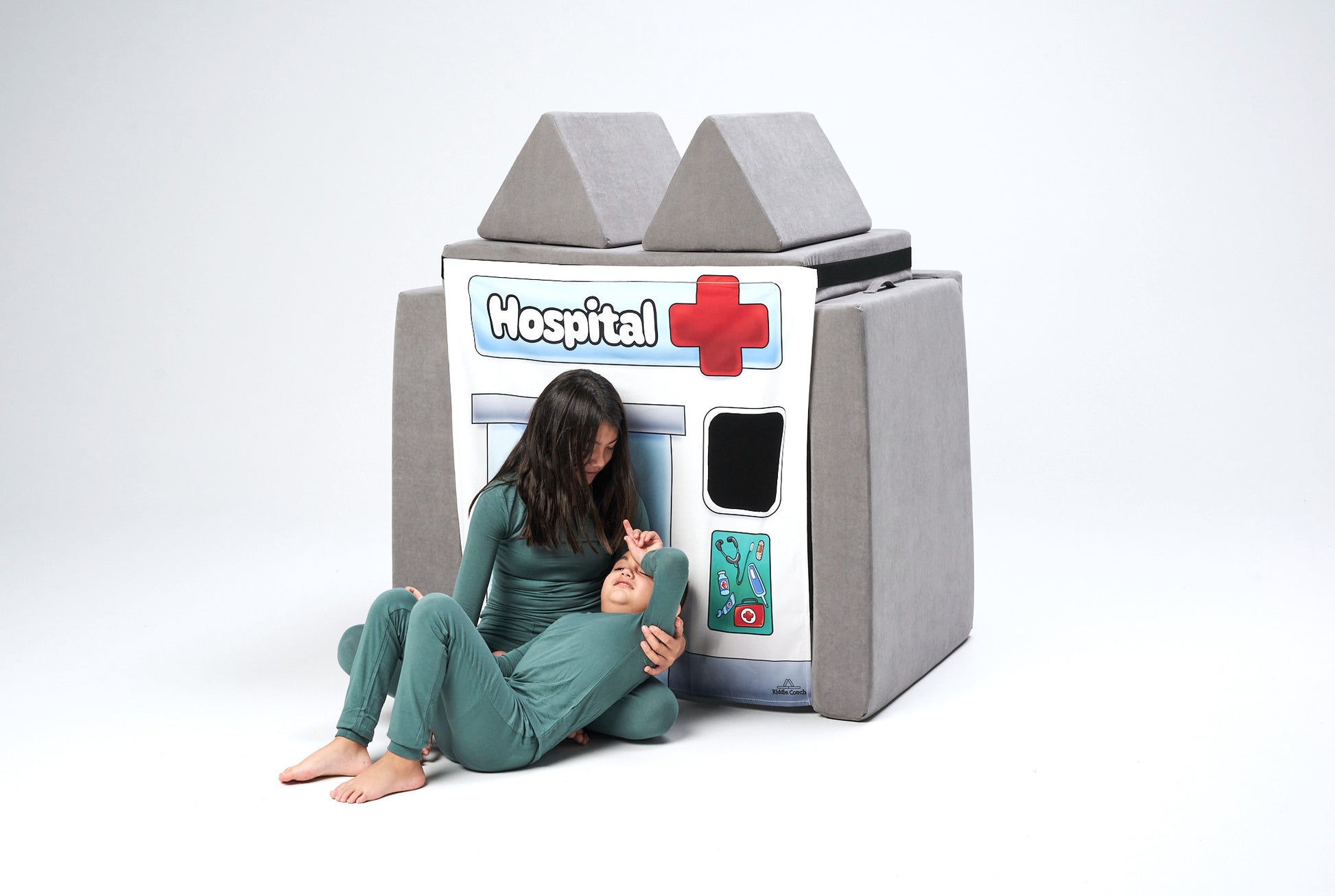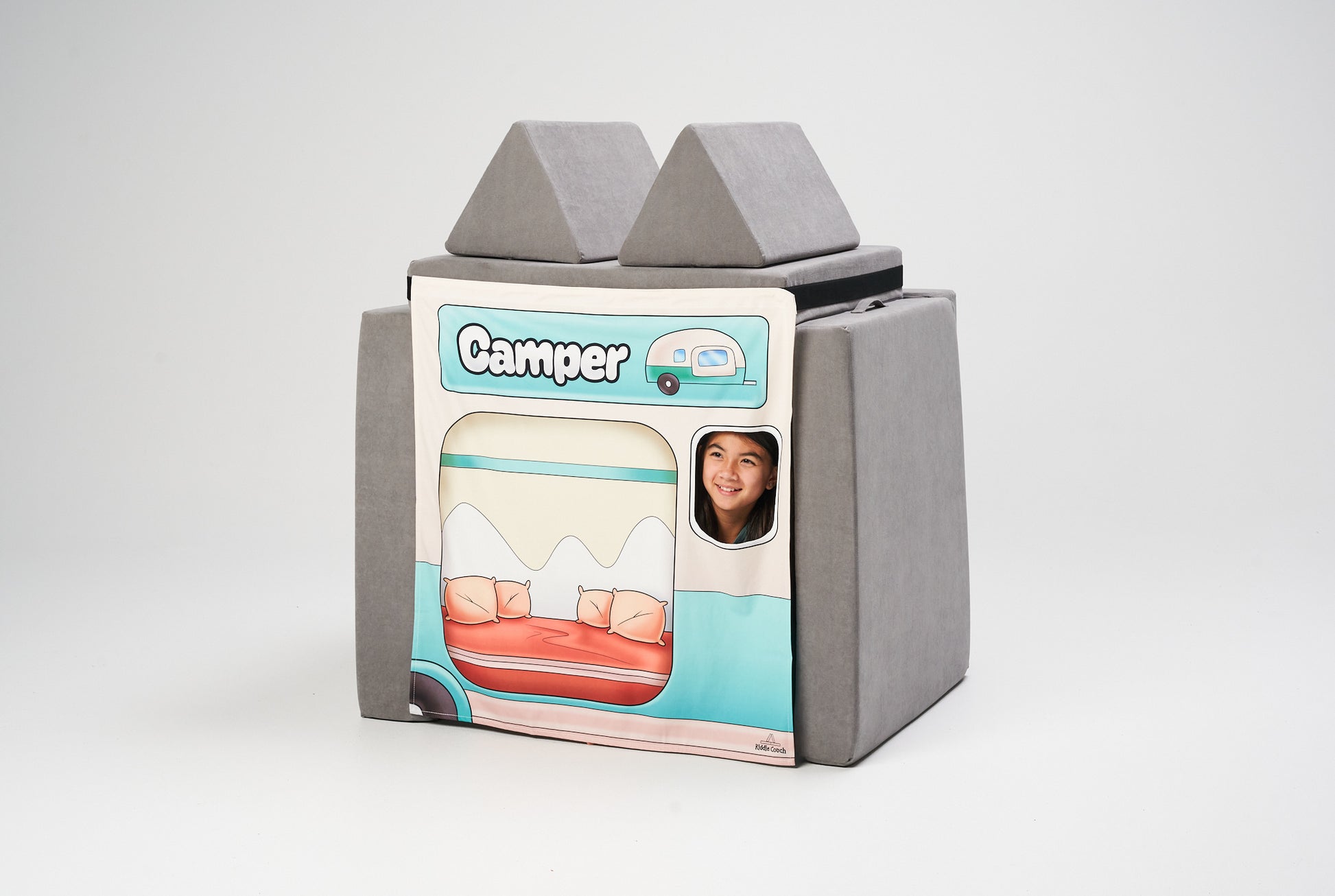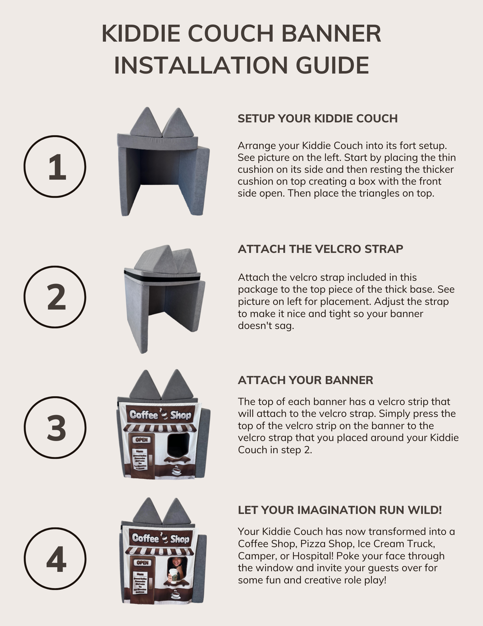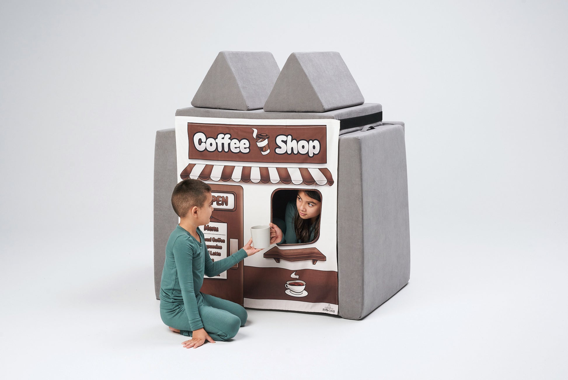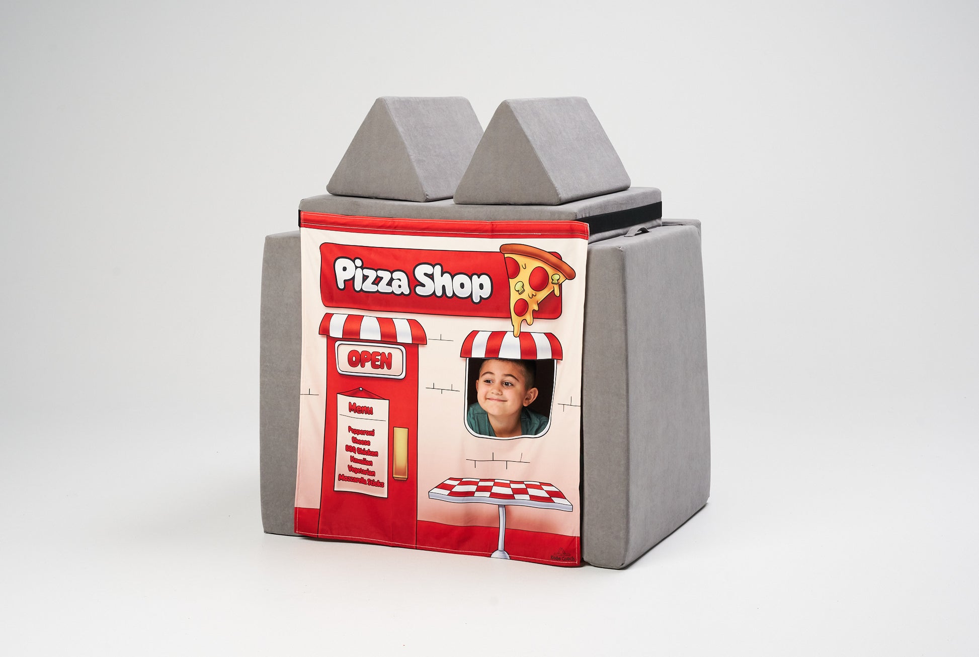 Simply set up your Kiddie Couch into a fort, secure the velcro strap, and hang your chosen banner—it’s that easy! In no time, kids can peek through the window, welcome you to their new “shop,” and dive into hours of role play. It’s a fun way to spark creativity, imagination, and social skills all at once.