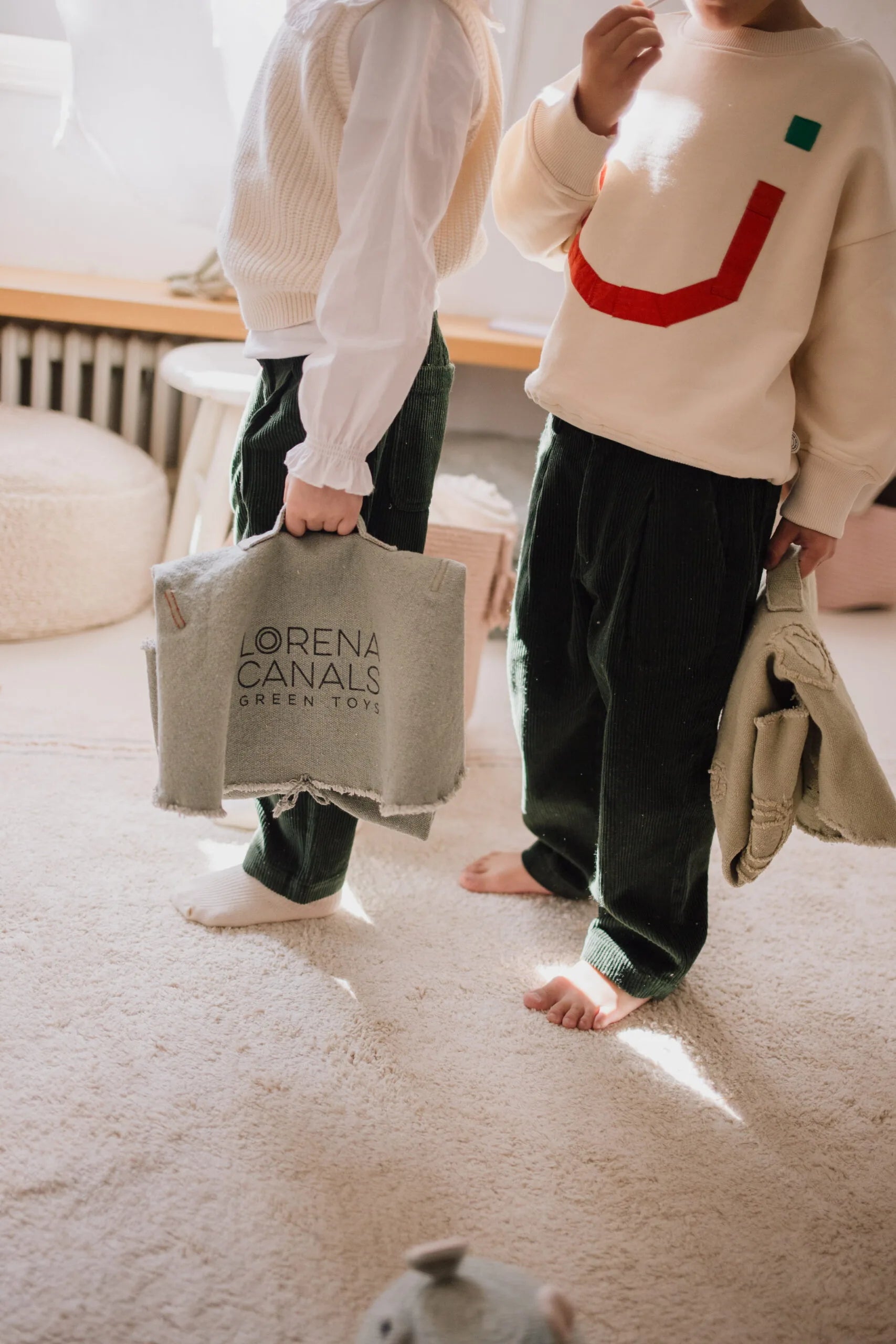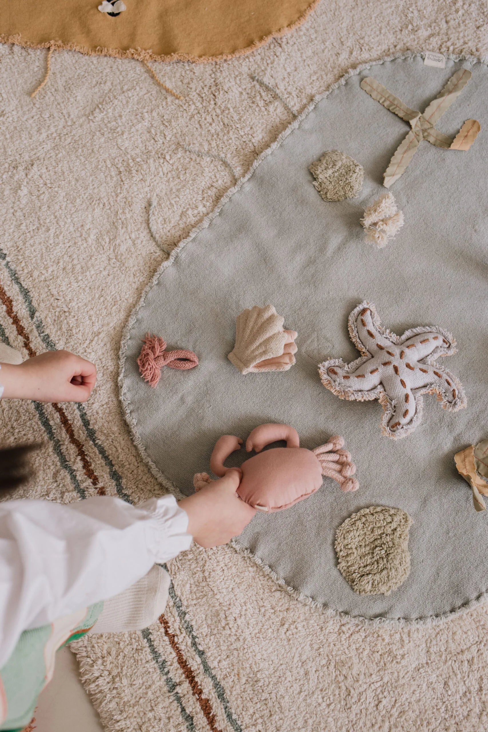 Explore the hidden life under the sea! A textile toy set that sparks imagination and interactive play. This base easily folds and ties up, converting it into a convenient briefcase while keeping the accessories inside for easy-to-carry playtime! This blue canvas with handcrafted lichen, algae and sea anemones comes with four handcrafted textile accessories: an embroidered starfish, a soft cotton poplin crab and two shells with a pearl. It is made by upcycling textile scraps from our own factory making it a sustainable choice for your kids toys. It comes packaged in a recycled cardboard box shaped like a house so they can continue playing! Recommended age +3 years