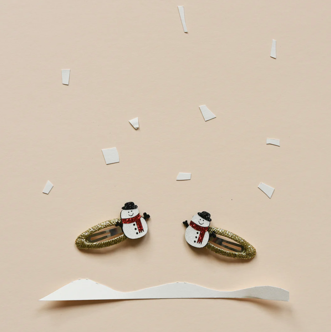 Our jolly snowman is made from a soft white glitter, and has a glittery scarf and top hat! Sat upon gold ribbon wrapped snap clips, these make the perfect snowy day accessory.